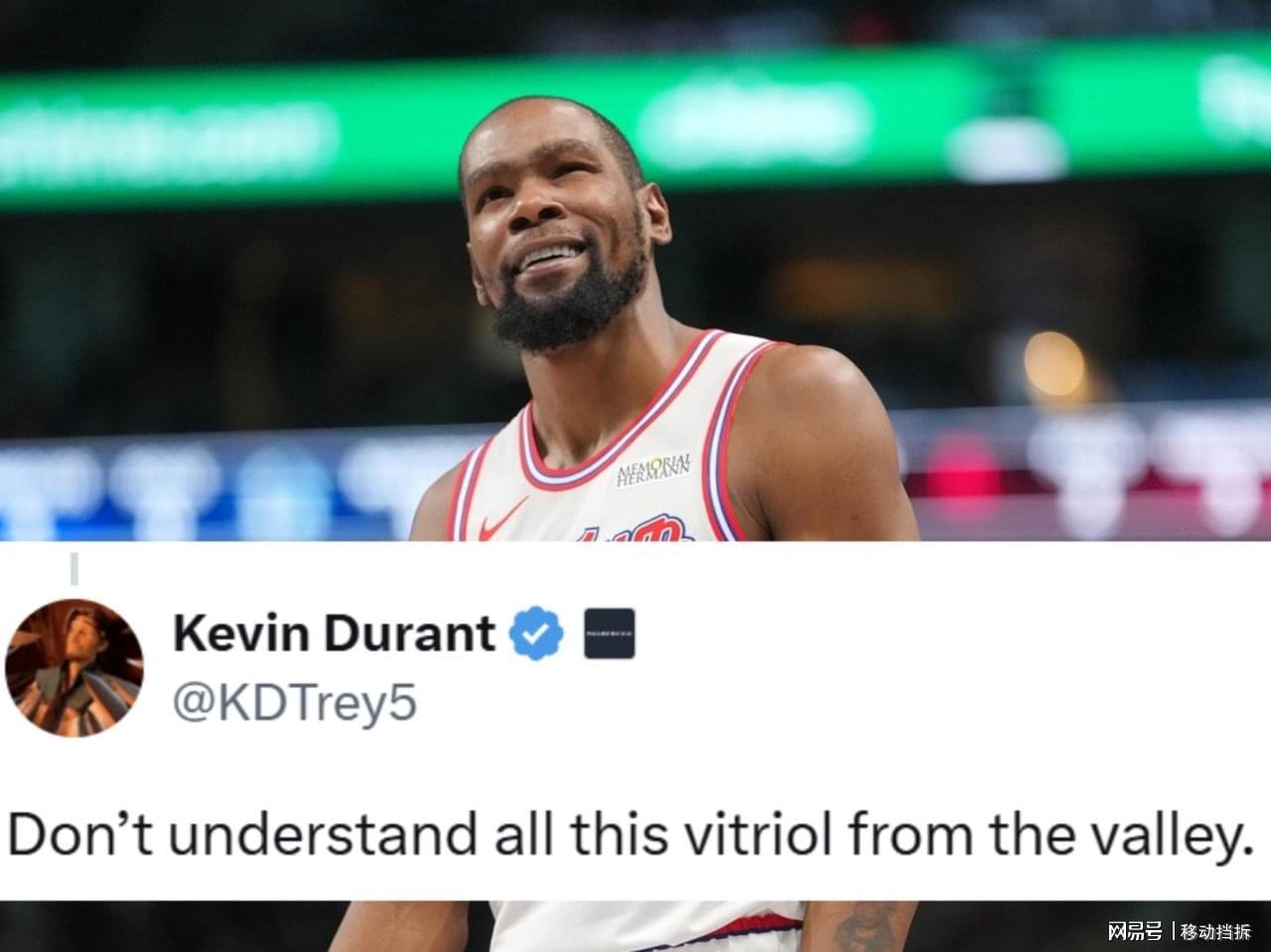 或许是面子挂不住的原因,亦或许是破防了。北京时间1月13日,杜兰特在自己的社交媒体上抱怨:“真心不明白,为什么太阳球迷对我有这么大的敌意。”